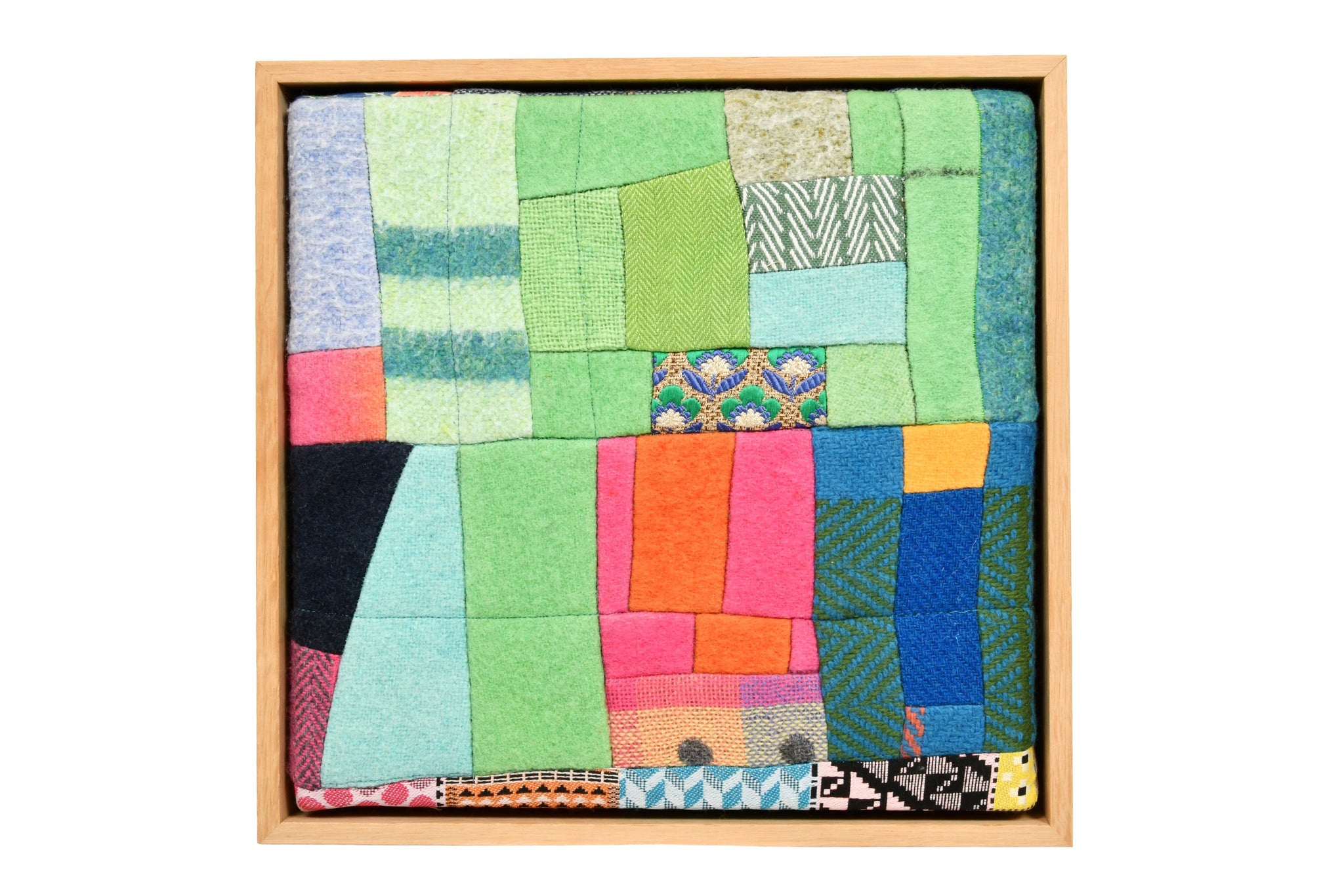 Mapping the Land is a one off textile piece created using repurposed vintage Foxford blankets, hand dyed wool, and hand stitching, framed in solid wood. The composition draws on the visual language of mapping, fields, boundaries, pathways, and shifting terrain, translated through colour, texture, and cloth.
